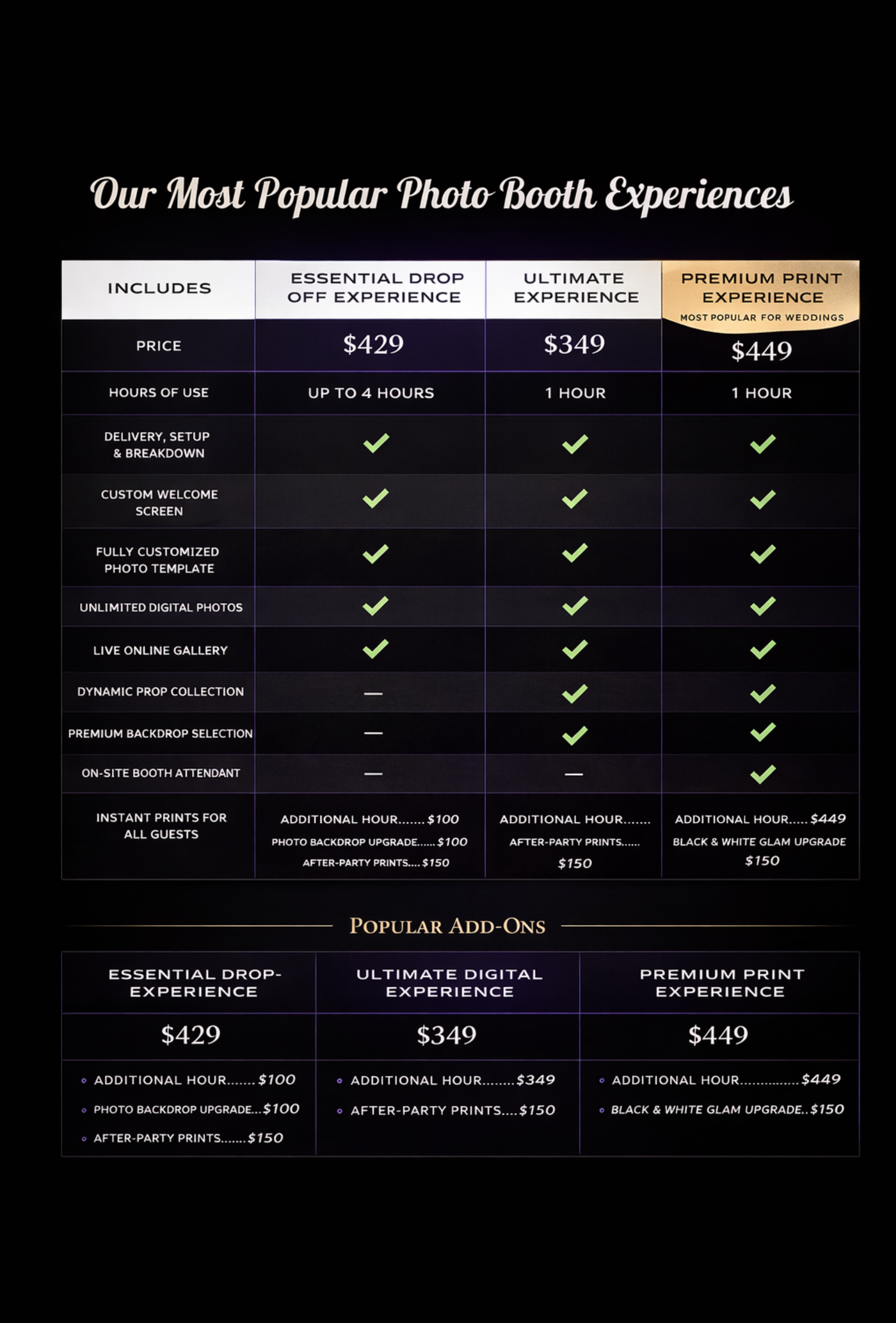 Select a photo booth package and add-ons that match your vision, celebration style, and budget.