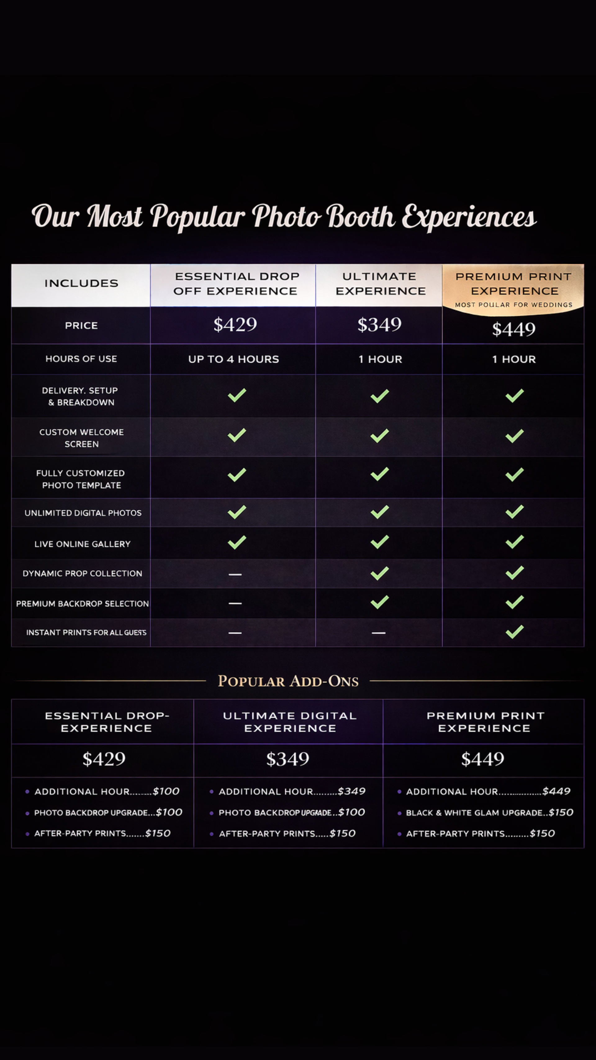 Select a photo booth package and add-ons that match your vision, celebration style, and budget.